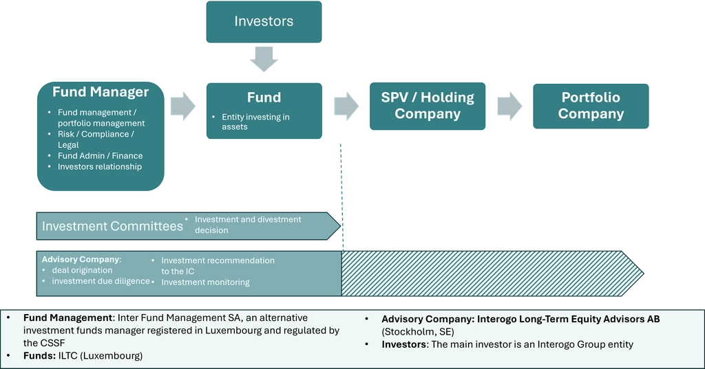 Investments and divestments for the Interogo Long-Term Equity strategy (LTE) are made through the investment fund Inter Long Term Capital SA by the fund manager Inter Fund Management (IFM) in line with the below governance model: